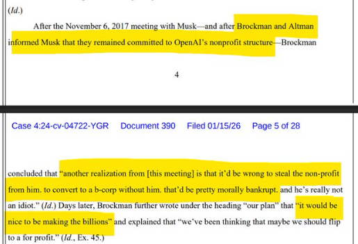 Third, the legal overhang. The ongoing case with Elon Musk is not noise. Based on current betting markets, Musk is favored to win at roughly 61% on Kalshi. I’m not a lawyer, but having read some of the recently released messages, it’s hard to ignore how damaging they look. At minimum, this introduces uncertainty at the worst possible time.